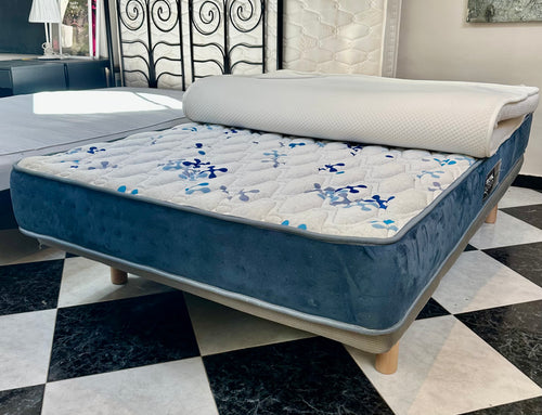 1088 - Very comfortable mattress from Spezia + topper + Tapi (solid) base. All in good condition! (120cm x 190cm)