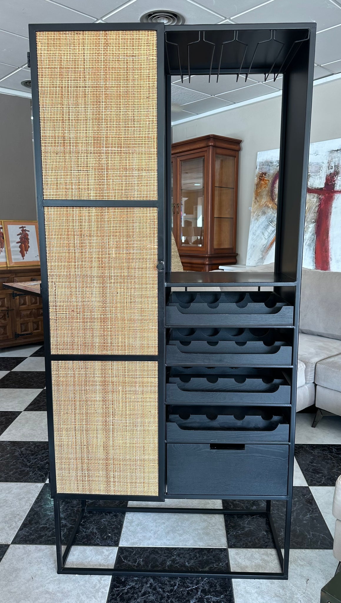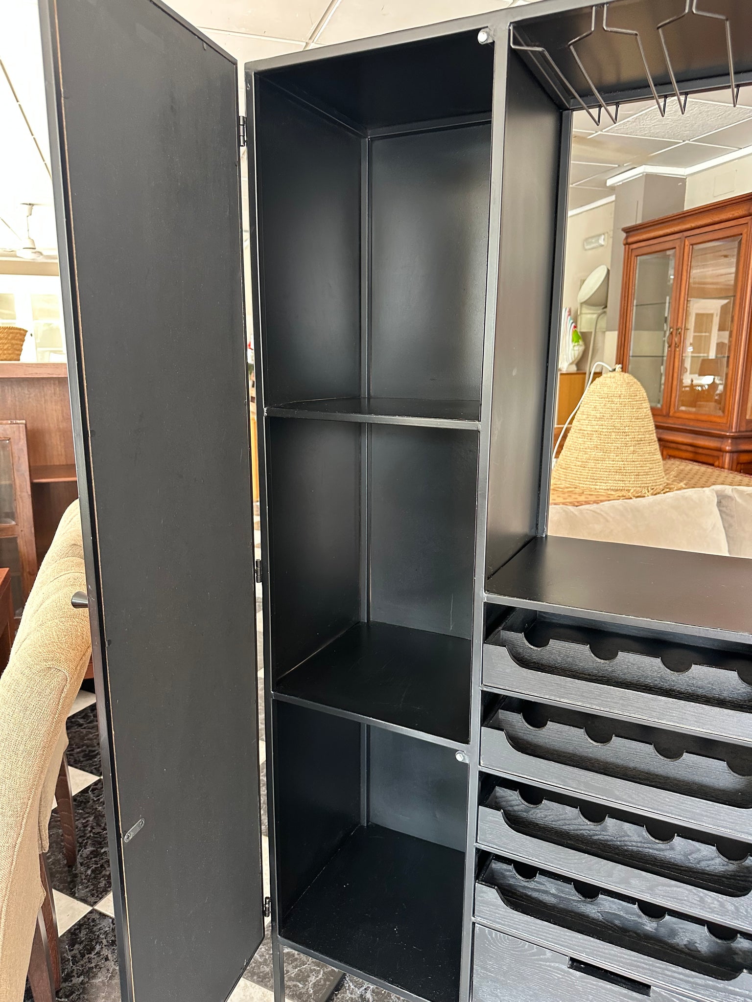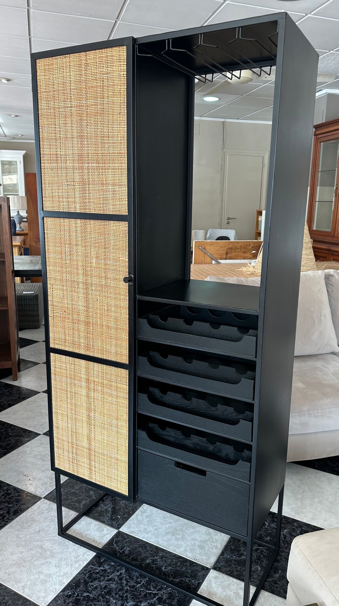 1051 - Wine shelf/cabinet, metal (80cm x 38cm, 176cm high).