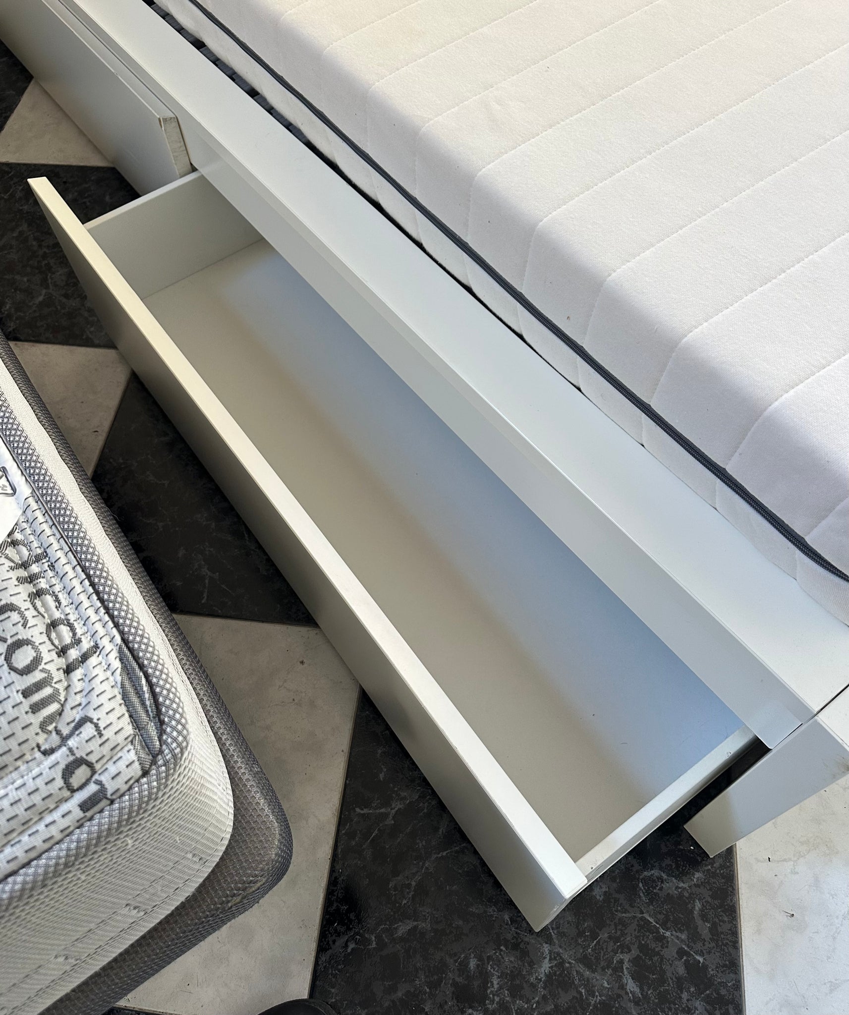 1043 - King size (160cm) bed frame with drawers and two mattresses (each mattress is 80cm x 200cm)